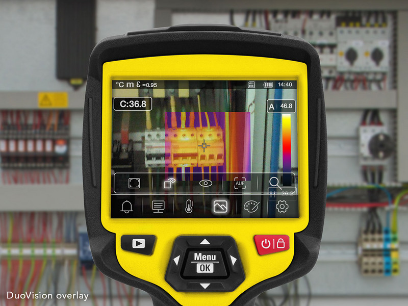 DuoVision Plus ფუნქცია ინფრაწითელი და რეალური გამოსახულების კომბინირებული ჩვენებისთვის, როგორც კონტურზე აქცენტირებული, დეტალურად გაუმჯობესებული თერმოგრამი